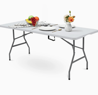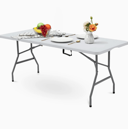 Look for something like the 6ft Folding Table Trestle Camping Party Picnic BBQ Stall Garden Indoor Outdoor. It’s big enough for a family setup, folds down for easy storage, and is sturdy enough to hold your fridge, stove, or food prep items.