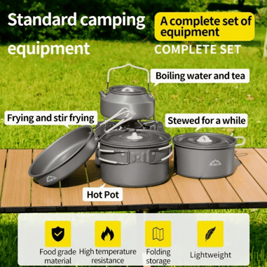 Mornings at the campsite are often cold, misty, and quiet—the perfect setting for a cup of tea or coffee. Enter the camping kettle with cooking set, a portable combo kit that includes a pot, pan, bowl, and even a foldable spatula. This compact cooking set is ideal for prepping breakfast or a warm soup without needing extra gear.